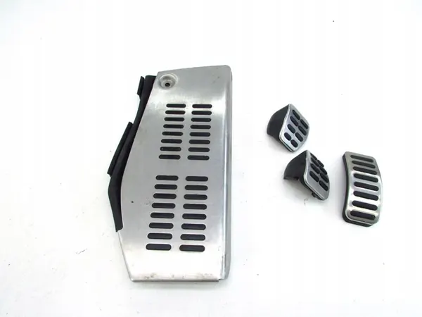 Metaal pedal covers voor AUDI A3 S3 8L, compatibel met verschillende benzinemotoren. Het artikel is in gebruikte staat met beschadigde bevestigingen en een gescheurd rubberdeel (zie afbeeldingen 9 en 10). Voertuigdetails: AUDI S3, geproduceerd in 2001, 3-deurs versie, Europees model, uitgerust met een 1.8 Turbo benzinemotor (210 pk, motorcode: APY) en een handgeschakelde versnellingsbak. Het onderdeel is origineel van de voertuigfabrikant (OE). OEM-nummers zijn 1J1864777A, 8N0721173A en 8N1721647.