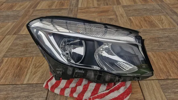Voorlamp rechts voor Mercedes GLA X156, onderdeelnummer A1569061200. Dit is een Europese versie, geen Engelse. De lamp is gebruikt en vertoont normale gebruikssporen. Hij is gerepareerd en mist een zijclip zoals op de foto's te zien is. Controleer de beschrijving en afbeeldingen zorgvuldig, aangezien deze het te koop aangeboden artikel weergeven. Het artikel is functioneel. Ik kan aanvullende vragen beantwoorden om misverstanden te voorkomen, en we kunnen samen de staat van het artikel beoordelen indien nodig.
