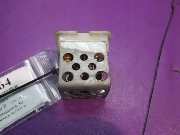 Verwarmingsweerstand, index 65664. Raadpleeg de beschrijving en afbeeldingen voor details. Onderdeelnummer: 5399663050, ontworpen voor airconditioning, met een 5-pins connector en 2 pinnen voor de ventilator (2.0 16V X20XEV 136PK Kombi) - kwaliteit A. Voertuigmodel: Opel Omega B. Productiejaren: 1994-1999. Productiejaar van het voertuig: 1996.